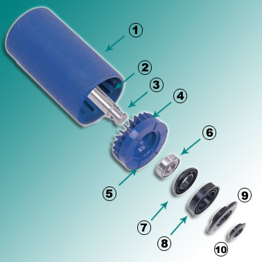 Roller construction ①Roller shall ②Strengthened Frame ③Shaft ④Bearing loading set ⑤Catchment lines ⑥Double cap bearing ⑦Female labyrinth ⑧Labyrinth seals ⑨Male labyrinth ⑩Sealing ring